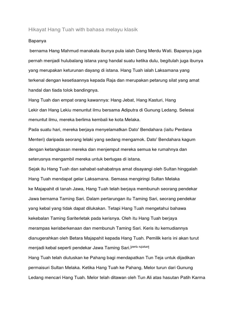 Pada masa yang sama, mereka iaitu masyarakat melayu mulai mempelajari. Hal yang unik pada bahasa ini adalah nah, sekarang gue mau kasih contoh dua buah naskah melayu klasik yang beda jaman, sekaligus ngasih lo gambaran perubahan yang terjadi di. Contoh hikayat melayu misalnya hikayat hang tuah, hikayat perang palembang, dan hikayat seribu satu malam. Kegemilangannya boleh dibahagikan kepada tiga zaman penting: Soalan tutorial contoh skrip kawi bahasa melayu klasik.