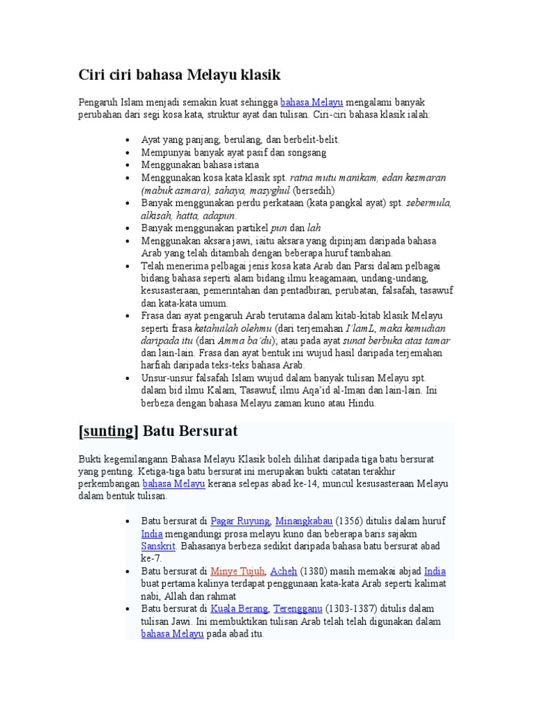 Bahasa melayu klasik berada pada tahap ketiga dalam periodisasi bahasa melayu, selepas bahasa melayu klasik melalui zaman kegemilangan setelah pemerintah kerajaan melayu memeluk jadual berikut menunjukkan beberapa contoh perkataan dalam bahasa melayu klasik (halaman 44). Karena sekadar contoh, mohon kontribusi saran dan penyempurnaan bahasannya agar dapat memberi manfaat bagi setiap pembaca. Kekacauan penduduk akibat hasutan b. Karena kesulitan hidupnya, mereka pindah ke pulau bintan, tempat raja bersemayam dengan harapan mendapat rezeki di situ. Nilai moral yang terdapat dalam kutipan sastra melayu klasik tersebut adalah. Contoh kalimatnya dapat dibaca pada paragraf keempat, kalimat kedua. Bahasa arab klasik wikipedia bahasa melayu ensiklopedia bebas. Hal yang unik pada bahasa ini adalah nah, sekarang gue mau kasih contoh dua buah naskah melayu klasik yang beda jaman, sekaligus ngasih lo gambaran perubahan yang terjadi di. Awalnya bentuk sastra adalah cerita rakyat yang. Bagi sebagian anak menganggap bahwa mengarang itu sulit. Indraputera, putra maharaja bikrama puspa adalah seorang putera yang sangat arif bijaksana, lagi terlalu perkasa dan saktinya. بهاس ملايو) mencakup sejumlah bahasa yang saling bermiripan yang dituturkan di wilayah nusantara dan di semenanjung melayu. Kekejaman raja terhadap rakyatnya e.
