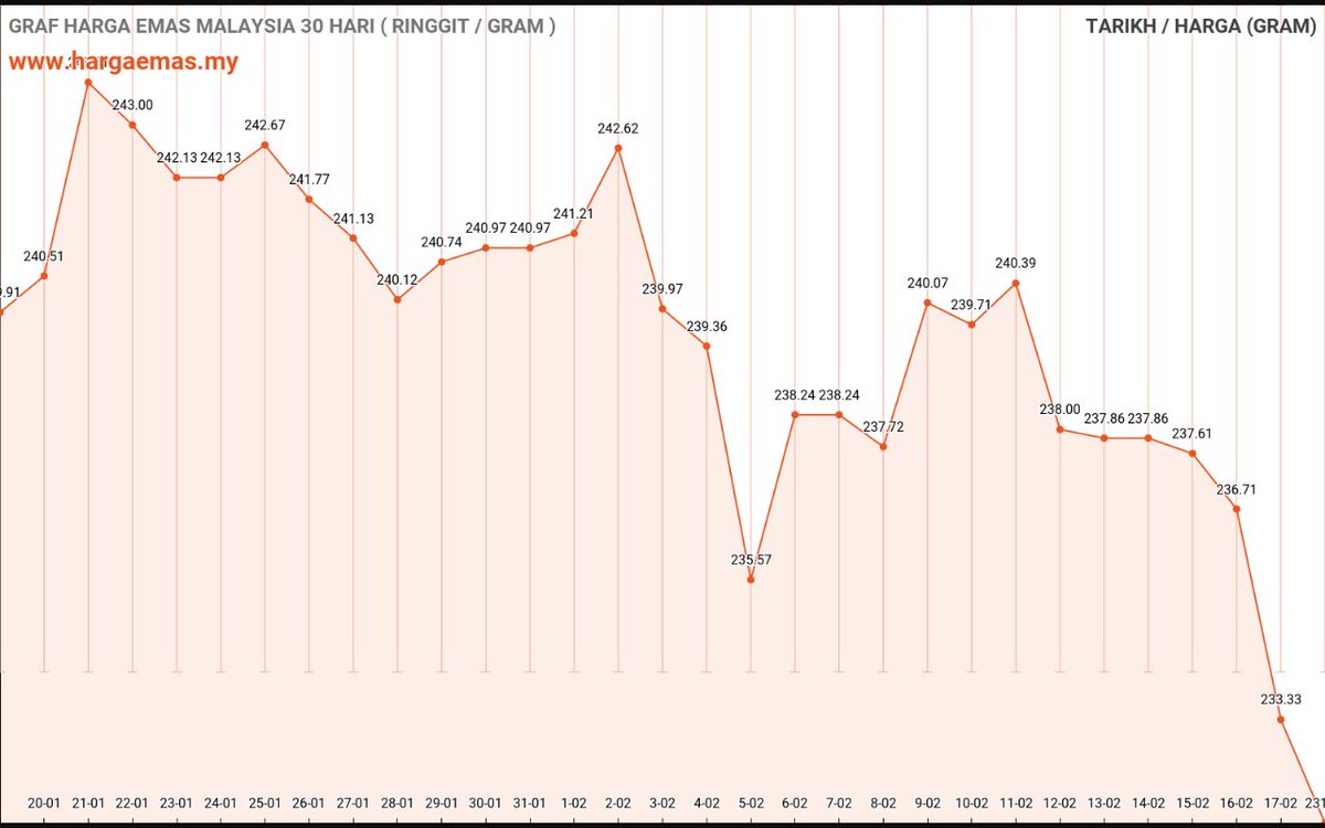 Ada juga yang masih tidak tahu pentingnya pelaburan emas di malaysia. Kegunaan emas dapat dibagi menjadi dua. Update harga emas hari ini setiap hari di malaysia untuk harga ar rahnu harga emas terpakai indeks emas semasa dan graf naik turun harga emas harian. Harga emas terkini di malaysia untuk harga 999 916 ar rahnu harga emas terpakai indeks emas semasa dan graf naik turun harga emas harian. Harga emas yang turun sehingga rm233 bagi satu gram hari ini menyebabkan kedai emas diserbu orang ramai.